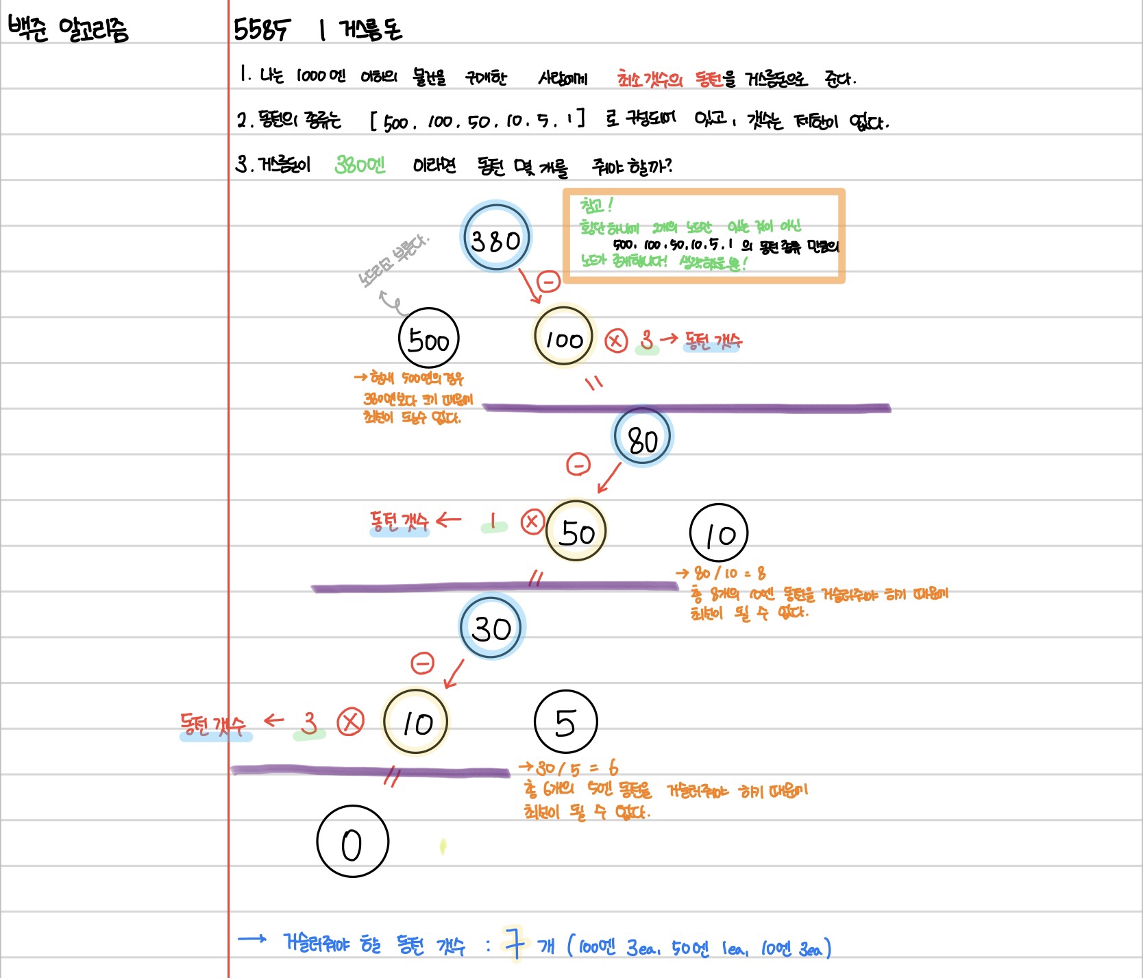 ํด๋น ๋ฌธ์ ๋ ๊ทธ๋ฆฌ๋ ์๊ณ ๋ฆฌ์ฆ์ ์ ๋ณด์ฌ์ฃผ๋ ๋ฌธ์ ์ค ํ๋์ด๋ค. ๋น๊ต์ ์ฝ๊ฒ ํ ์ ์๋ค. ํธ๋ฆฌ ๊ตฌ์กฐ์์ ํ๋์ ํก๋จ์ 500, 100, 50, 10, 5, 1 ์ ๊ฐ์ ๊ฐ์ง ๋ ธ๋๊ฐ ์๋ค๊ณ ์๊ฐํ๊ณ ์ต์ ์ ์ ํ์ ํตํ ์ต์ ํด(ํด๋น ๋ฌธ์ ์์๋ ์ต์ํ์ ๋์ ๊ฐ์)๋ฅผ ๊ตฌํ๊ณ ์ ํ๋ค๋ฉด ์๋์ ๊ทธ๋ฆผ์ฒ๋ผ ๋ ๊ฒ์ด๋ค.